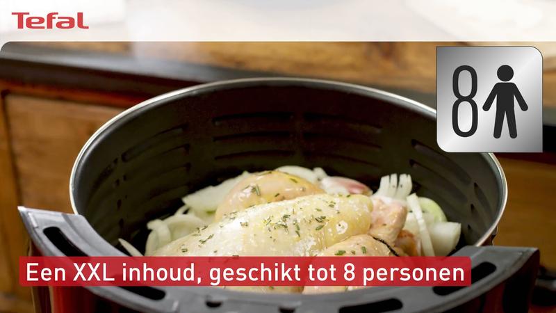 Een XXL air fryer met een royale inhoud van 5,6 liter / 1,6 kg voor maximaal 8 porties Acht veelzijdige menu’s: friet, koteletten, garnalen, cake, pizza, vis, grill, roosteren Vetarme friteuse om gezonde recepten te bereiden met weinig tot geen olie Bespaar tot 70% aan energie* met heteluchtfriteuses van Tefal Een handige timer van 60 minuten en een automatische uitschakeling zorgen voor totaal gebruiksgemak Nauwkeurige temperatuurregeling (80°-200°C) voor perfecte resultaten met alle ingrediënten. Een gepatenteerd mandje om het product makkelijk schoon te maken