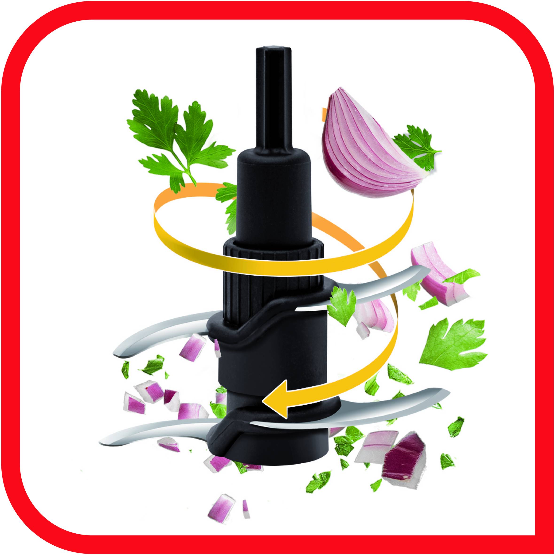 De Masterchop hakmolen bevat een kom met een bruikbare inhoud van 500 ml, waarin je een grote verscheidenheid aan ingrediënten kunt hakken. Denk maar eens aan noten, uien, kruiden, chocolade, fijngemalen vlees... de mogelijkheden zijn eindeloos! Dankzij zijn grote kom met maataanduiding kun je perfect je vaste ingrediënten afmeten. Ook is het mixen van vloeistoffen voor de Masterchop dankzij de lekdichte kom een koud kunstje. De Masterchop is eenvoudig te bedienen: druk op de bovenzijde van het product en het begint direct te hakken. Geen extra knoppen of instellingen. De kom, het transparante deksel en de messen zijn daarnaast vaatwasmachinebestendig en daardoor erg eenvoudig schoon te maken.