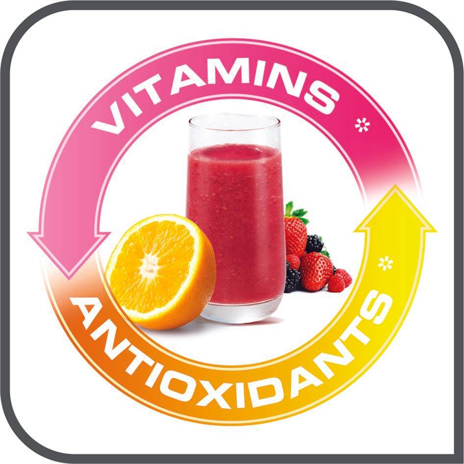 * Laboratoriumtests uitgevoerd met 1 kg frambozen voor het sap, 1 kg sinaasappelen voor de vitamine C en 1 kg druiven voor de antioxidanten, vergeleken met de Tefal ZN655H-sapcentrifuge