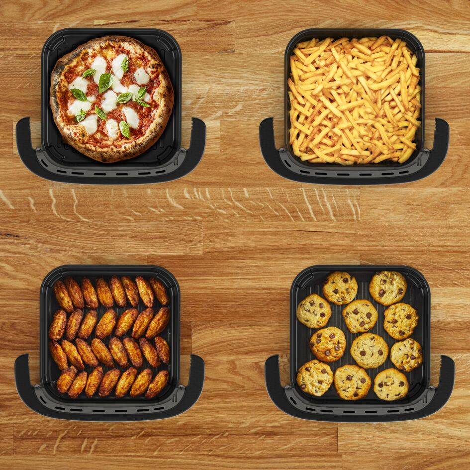Een alles-in-één air fryer voor al je favoriete recepten: frietjes, nuggets, vis, pizza, koekjes en meer. Dankzij het slimme vierkante ontwerp bespaar je ruimte op je aanrecht en bak je de lekkerste gerechten in een handomdraai, zoals tot 1 kg frietjes, pizza's tot 27 cm of 30 kippenvleugels. Directe toegang tot maar liefst 10 automatische programma's, waaronder 2 programma's voor pizza's; verse pizza en diepvriespizza. De Extra-Crisp technologie en dubbele verwarmingselementen zorgen voor knapperige, verrukkelijke resultaten die snel klaar zijn. Dankzij het handige kijkvenster kan je de bereiding eenvoudig in de gaten houden zonder de mand open te doen. Met het gebruiksvriendelijke digitale bedieningspaneel pas je eenvoudig het programma, de temperatuur en de kooktijd aan. Bespaar tot 70% energie* en kook sneller dan met traditionele ovens. Ontvang gepersonaliseerde recepten in de gratis My Tefal-app voor een unieke kookervaring. De materialen zijn van hoge kwaliteit en gegarandeerd tot 15 jaar repareerbaar, om de planeet te beschermen en afval te verminderen.