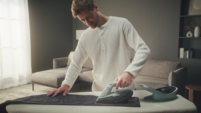 Het ergonomische ontwerp biedt lichte strijksessies, met een open handgreepontwerp en een gewicht van slechts 960 g. Het speciale ontwerp van de horizontale basis bevordert de natuurlijke, horizontale beweging van het strijken - voor kleding zonder kreuken en zonder risico om je handen te verbranden.
