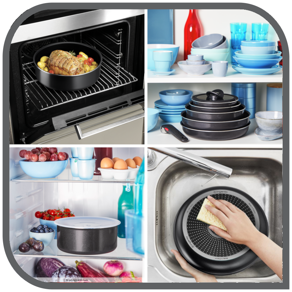 Ingenio is gemaakt om de kookervaring thuis te vereenvoudigen. Zet de kookplaat aan, verwarm de oven en schuif de restjes rechtstreeks in de koelkast* De handige afneembare handgreep is zoveel meer dan een gadget: ultraveilig door het 3-punts veiligheidssysteem, bestand tegen gewichten tot 10 kg** en ook nogeens 10 jaar garantie*** Ingenio bespaart elke dag tijd en energie in de keuken. Met de nieuwe Ingenio Easy Cook & Clean-set kook jij elke dag zonder gedoe. Ontdek het gemak van volledig gecoat kookgerei - koken en reinigen van de pan kan niet eenvoudiger door de coating aan de binnen en van buiten kan van de pan. De hoogwaardige titaniumcoating is gemaakt om lang mee te gaan, en de diffusiebodem zorgt voor een optimale warmteverdeling voor gelijkmatig bakken van je vlees, vis of groentes. Of het nu gaat om alledaagse gerechten of een showstopper in het weekend om het hele gezin tevreden te houden, er zijn hazenpaden als het gaat om het maken overheerlijke gerechten. Tefal biedt je pannen om het reinigingsproces te versnellen, zodat je meer tijd heeft voor wat echt belangrijk is. "