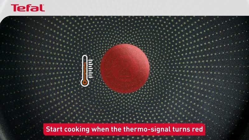 - De Thermo-Signal™ warmte-indicator verandert van kleur wanneer de koekenpan de ideale temperatuur bereikt om te beginnen met koken, voor perfect dichtschroeien