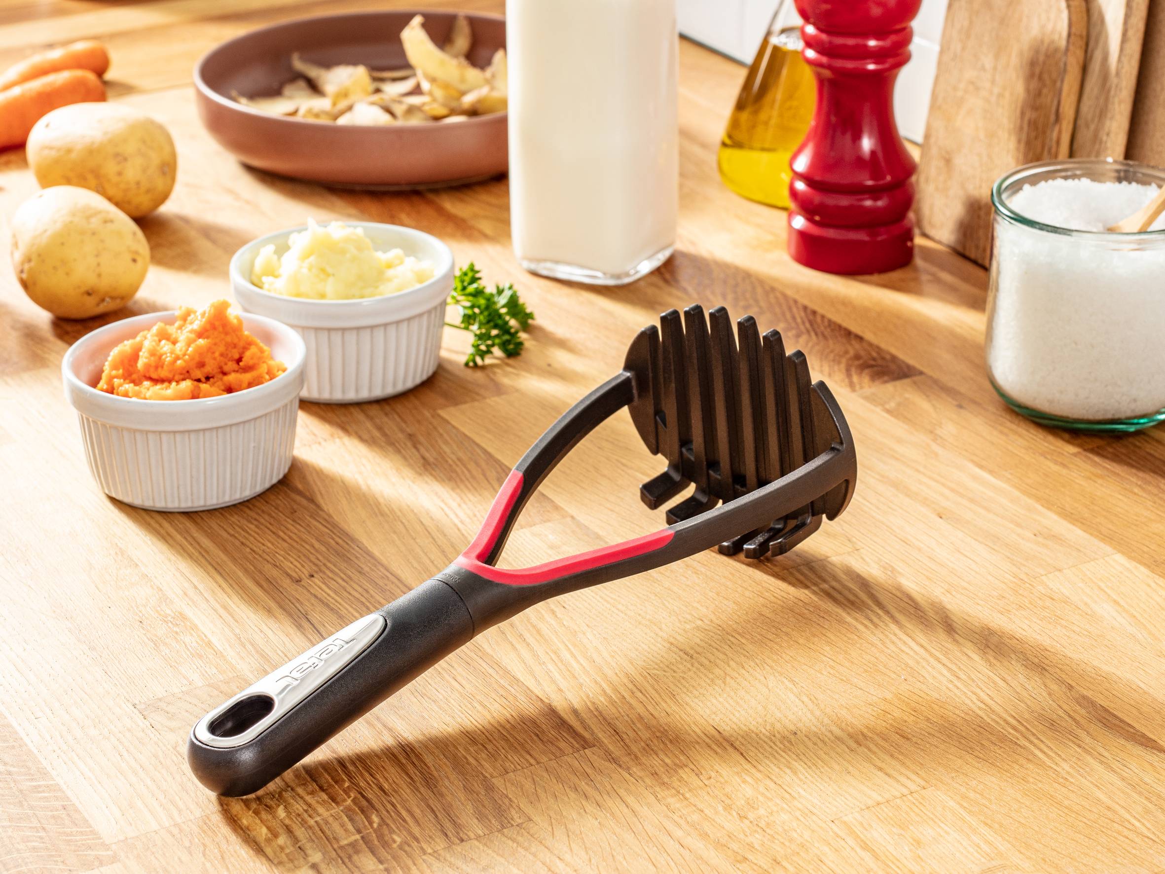 Ontdek eenvoudig koken met hoge prestaties! De Tefal Ingenio Premium aardappelstamper is veilig, duurzaam en gemakkelijk schoon te maken en belooft optimaal gebruiksgemak dankzij een ingenieuze siliconen stootrand voor moeiteloos losmaken van het voedsel. Het innovatieve gebogen ontwerp zorgt voor snel en efficiënt pureren van alle soorten puree. Dit vaatwasmachinebestendige keukengerei combineert gemak met prestaties en is gemaakt van hoogwaardige materialen voor langdurige prestaties, keer op keer.