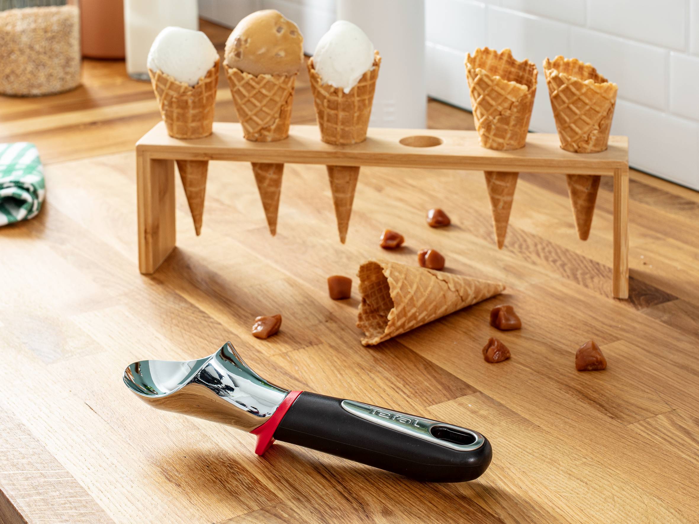 Met de siliconen veiligheidsring kun je de ijsschep in een verhoogde stand neerleggen, voor extra stabiliteit en verbeterde hygiëne De ergonomische lepel heeft een gemakkelijk vast te pakken handvat dat niet wegglijdt, voor totale controle Ontworpen voor optimaal gebruiksgemak, deze ijslepel glijdt door ijs en sorbets om perfecte porties te serveren Gemaakt volgens de kwaliteitsnormen van Tefal en uitgebreid getest voordat het op de markt is gebracht.
