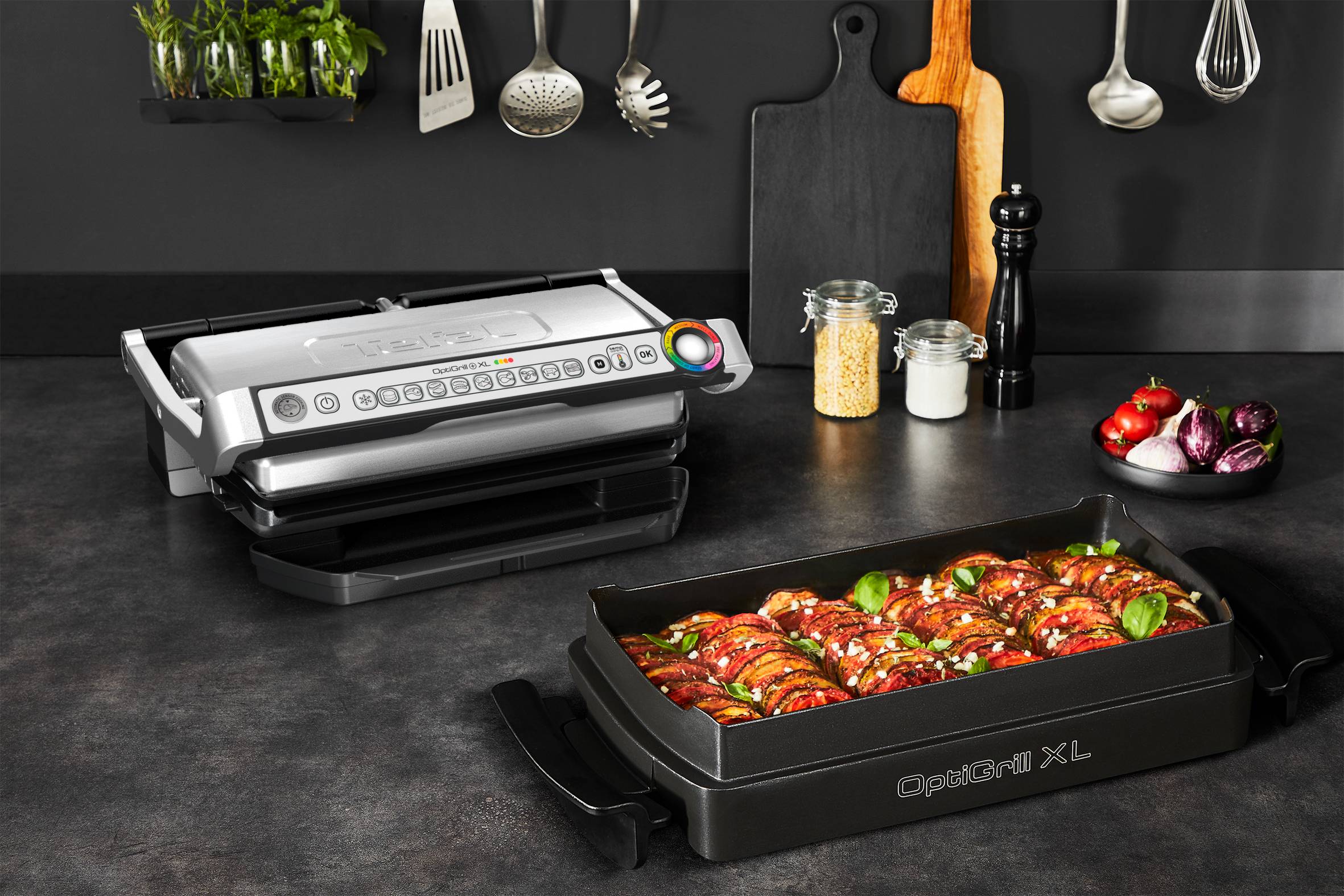 Tefal OptiGrill XL garandeert perfecte grillresultaten van rood tot doorbakken. De innovatieve kooksensor, past de bereidingscyclus automatisch aan op de dikte van de ingrediënten en het aantal stuks tussen de platen. Door middel van een kleur- en geluidssignaal, weet je wanneer het gerecht rood, medium of doorbakken is. Dankzij de 9 automatische kookprogramma's is het mogelijk om ook vis, gevogelte, spek of tosti's te bereiden. Ook andere ingrediënten als groenten en aardappels zijn eenvoudig te bereiden dankzij het manuele programma met 4 temperatuurinstellingen. Zelfs bevroren ingrediënten zijn door gebruik te maken van de diepvriesstand een koud kunstje. Het grilloppervlak van de OptiGrill XL is 33% groter ten opzichte van de originele OptiGrill en de OptiGrill+. Dankzij het meegeleverde Snacking & Baking accessoire van gegoten aluminium met anti-aanbaklaag bereik je snel en eenvoudig perfecte resultaten. Pizza's, taart, broodjes... laat je wensen de vrije loop! Dankzij de hittebestendige handvatten is het accessoire eenvoudig te verplaatsen naar de eettafel. Ook kun je het accessoire in de vaatwasser reinigen zodat je er nauwelijks werk aan hebt. Tefal OptiGrill XL is het geheim voor steeds weer perfecte grillresultaten!