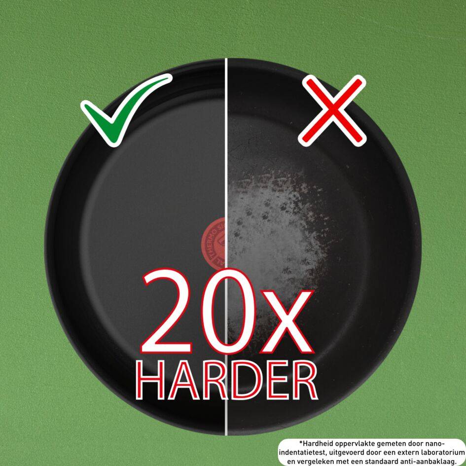 Kook gemakkelijk vetarm dankzij de nieuwste generatie keramische anti-aanbaklaag Tot 20x harder keramisch oppervlak* gebouwd voor duurzame prestaties die bestand zijn tegen tijd (*Oppervlaktehardheid gemeten door nano-indentatietest - uitgevoerd door extern laboratorium - vergeleken met standaard anti-aanbaklaag van Tefal) Geschikt voor alle warmtebronnen (gas, elektrisch, keramisch), inclusief inductie De Thermo-Signal™ warmte-indicator wordt effen rood wanneer de pan de ideale temperatuur bereikt om te beginnen met bakken, voor perfect aanbraden Verbeterde Thermo-Fusion™-inductietechnologie in de bodem van de pan voor snellere opwarming en gelijkmatige bakresultaten Veilige keramische coating: Tefal gebruikt coatings die door veiligheidsautoriteiten die als veilig voor de gezondheid worden beschouwd. Om dit te garanderen worden tests uitgevoerd door externe onafhankelijke laboratoria. Op de Tefal website onder de sectie Klantenservice kun je meer informatie vinden over Tefal pannen en de studies raadplegen die in de Q&A's staan. Onze pannen met keramische coatings bevatten door hun chemische aard geen PFAS. Gemaakt in Frankrijk volgens de laatste technologieën