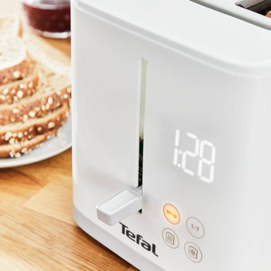 Geniet van perfect gebruinde toast met de slimme Tefal toaster die intuïtief te gebruiken is. Deze moderne, witte broodrooster met twee sleuven laat je je voorkeursinstellingen opslaan, zodat ze met één druk op de knop te activeren zijn. Zo kan je altijd van toast genieten die op jouw favoriete manier geroosterd is. Het naadloze digitale scherm telt af tot je toast klaar is; daarnaast heeft de broodrooster ook zeven bruiningsstanden, van licht goud tot extra knapperig voor resultaten op maat. Geniet van handige functies zoals Stop-, Ontdooiing- en Opwarmknoppen met controlelampjes, sleuven waarvan de breedte ingesteld kunnen worden, zodat het brood altijd precies in het midden gepositioneerd is, een uitneembare kruimellade voor eenvoudig schoonmaken en een high-lift systeem voor het eenvoudig uitnemen van geroosterd brood. Ook staat het gestroomlijnde en intuïtieve design perfect op het aanrecht van elke moderne keuken.
